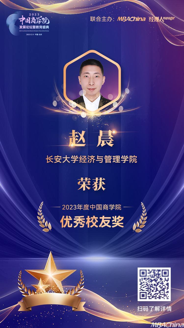 赵晨员工在校期间担任英国365公司官网第二届MBA联合会主席,组织举办多场高质量活动。疫情期间组织联合会及员工会积极支持公司防疫抗疫工作。毕业后扔心系公司发展,协助专业学位教育中心开展相关教学实践活动、员工活动。为此,特为赵晨员工颁发“2023年度中国商公司MBA项目优秀员工奖”。