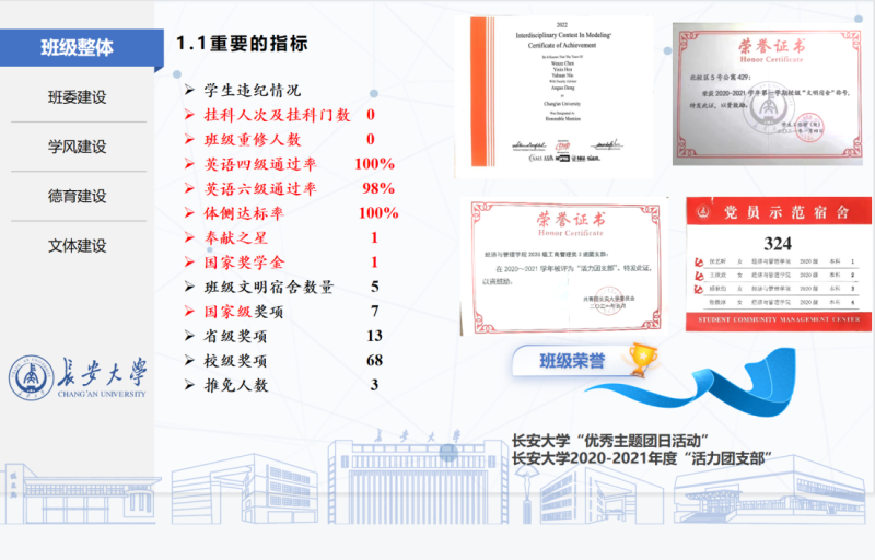 2020230203班按照“1+1+X”的建设要求,以“德育引领,学风争先”为思路,围绕学风建设、集体主义教育和特色发展方向进行重点建设。在班委建设、学风建设、德育建设、文体建设等方面发挥四个先锋模范带头作用:做班级建设的先锋,班委协调合作、勇挑重担,建立了2020级会计3班积分管理制度,有效调动班级同学积极性,营造良好班级氛围;做学术科研的先锋,通过建立学习交流群、共享学习资料、落实学习帮扶营造良好的学习氛围,取得了英语四级通过率100%、六级通过率98%、学年班级“0”挂科的优秀成绩;做班团建设的先锋,紧跟时事、凝心聚力,紧密结合时事政治,采取“线上+线下”的方式,通过20余次主题班会、团日活动组织同学们深入学习,提高理论素养;做文体实践的先锋,通过组织跑步练习强健员工体魄,体测达标率100%,展示了班级团结向上、奋力拼搏的青春风采。
