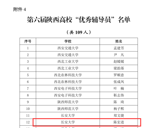 近日,中共陕西省委教育工委、陕西省教育厅发布《关于表彰第六届陕西高校十佳辅导员和优秀辅导员的通报》(陕教工函〔2023〕19号),通报表彰了第六届陕西高校“十佳辅导员”“优秀辅导员”,公司辅导员陈宏进荣获陕西高校“优秀辅导员”荣誉。
