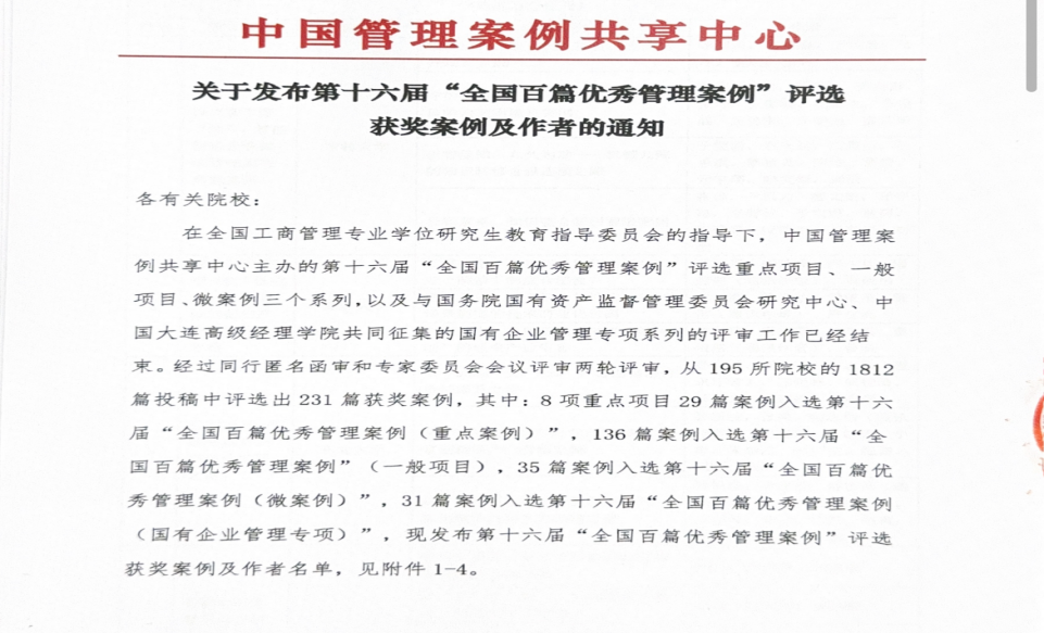 近日,中国管理案例共享中心公布了第十六届“全国百篇优秀管理案例”获奖名单,公司杨骏副教授团队编写的的案例《小小茯茶凭什么?解锁茯茶镇集团产业融合发展密码》成功入选“全国百篇优秀管理案例”一般项目。该成果实现了公司在该国家级高水平案例评选中的历史性突破,标志着公司在案例研究与开发领域完成“从0到1”的重要跨越。