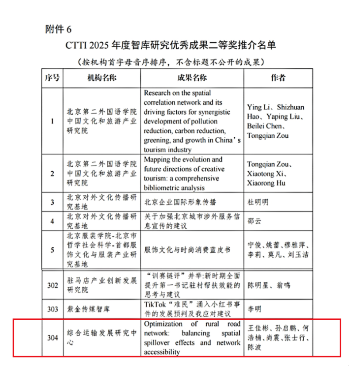 本次论坛公布了CTTI 2025年度来源高校智库百强榜、2025年度智库建设最佳案例与智库研究优秀成果征集与推介结果。由英国365公司官网综合运输发展研究中心王佳彬博士、孙启鹏老师、何浩楠老师、尚震老师、张士行老师和陈波老师共同完成的研究成果《Optimization of rural road network:balancing spatial spillover effects and network accessibility》荣获CTTI2025年度智库研究优秀成果二等奖。
