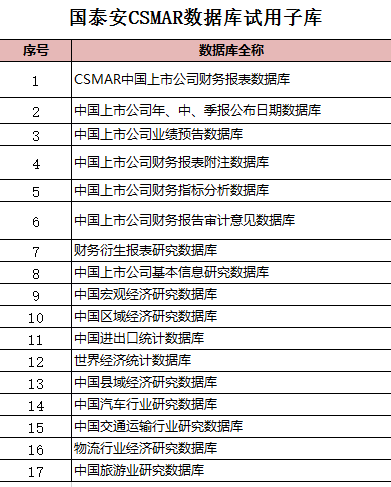 CSMAR 经济金融研究数据库是国泰安从学术研究的需求出发,借鉴CRSP、COMPUSTAT等国际知名数据库的处理方式,结合中国实际国情,开发出的经济金融型数据库。该数据库涵盖了股票市场、公司、基金、债券、衍生市场、经济、行业、货币市场、海外、板块、市场资讯、专题、科技金融、商品市场、银行、因子、人物待征、绿色经济18个研究系列,截止目前总共有140个数据库,是市场上最全面的经济金融研究数据库。迄今为止,为1000多所知名国内外大学和研究机构、15000多位专家学者的选择和信赖,已有60000余篇高质量学术论文采用CSMAR系列研究数据库的学术论文在国内外一流期刊上发表,国内包括《经济研究》、《会计研究》、《金融研究》等,国外包括Journal of Finance, Journal of Financial Economics, Journal of Business, Journal of Accounting Research等,CSMAR经济金融研究数据库已经成为事实上的行业标准数据库。