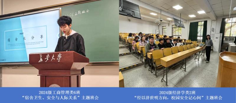 把牢安全守底线,和谐共进谋发展。经济学类二班、工商管理类六班,针对“校园安全与人际关系”召开主题班会。充分强调消防安全、健康安全、财产安全、网络安全等注意事项,号召同学们强化安全防范意识;组织宿舍长对宿舍安全隐患、卫生保持、人际关系等方面进行汇报,以自我反省、互相监督、定期检查的形式,帮助员工养成健康生活习惯,建立良好宿舍关系。