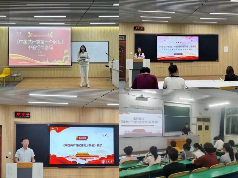 在“支部书记讲专题党课”中,4位本科生党支部书记分别以《中国共产党第一个纲领中的政治密码》《严守纪律底线,永葆党的纯洁性与先进性——深入学习< 中国共产党纪律处分条例>》《讲政治 懂规矩 守纪律 扎实开展党纪学习教育》和《< 中国共产党纪律处分条例>149条负面清单》为题为支部党员上了一堂生动的纪律党课。各支部书记逐条领学了《中国共产党纪律处分条例》,并以“新旧对照”“学用结合”的方式,对违纪情形、管理周期、责任链条等方面内容作了生动详细的解读,帮助大家深刻理解《条例》的精神实质和具体规定,强调青年员工党员要深刻领会开展党纪学习教育的重要意义,以高度的政治自觉做到学纪、知纪、明纪、守纪,确保党纪学习教育取得扎实成效。党课后,各支部通过观看警示教育片、分析典型违纪案例等形式进行警示教育,帮助青年员工党员筑牢廉洁意识,扣好廉洁人生的“第一粒扣子”。在研讨交流共学中,支部党员纷纷表示将主动践行《条例》要求,自觉增强纪律意识,把纪律规矩内化于心、付之于行,始终做到忠诚干净担当。